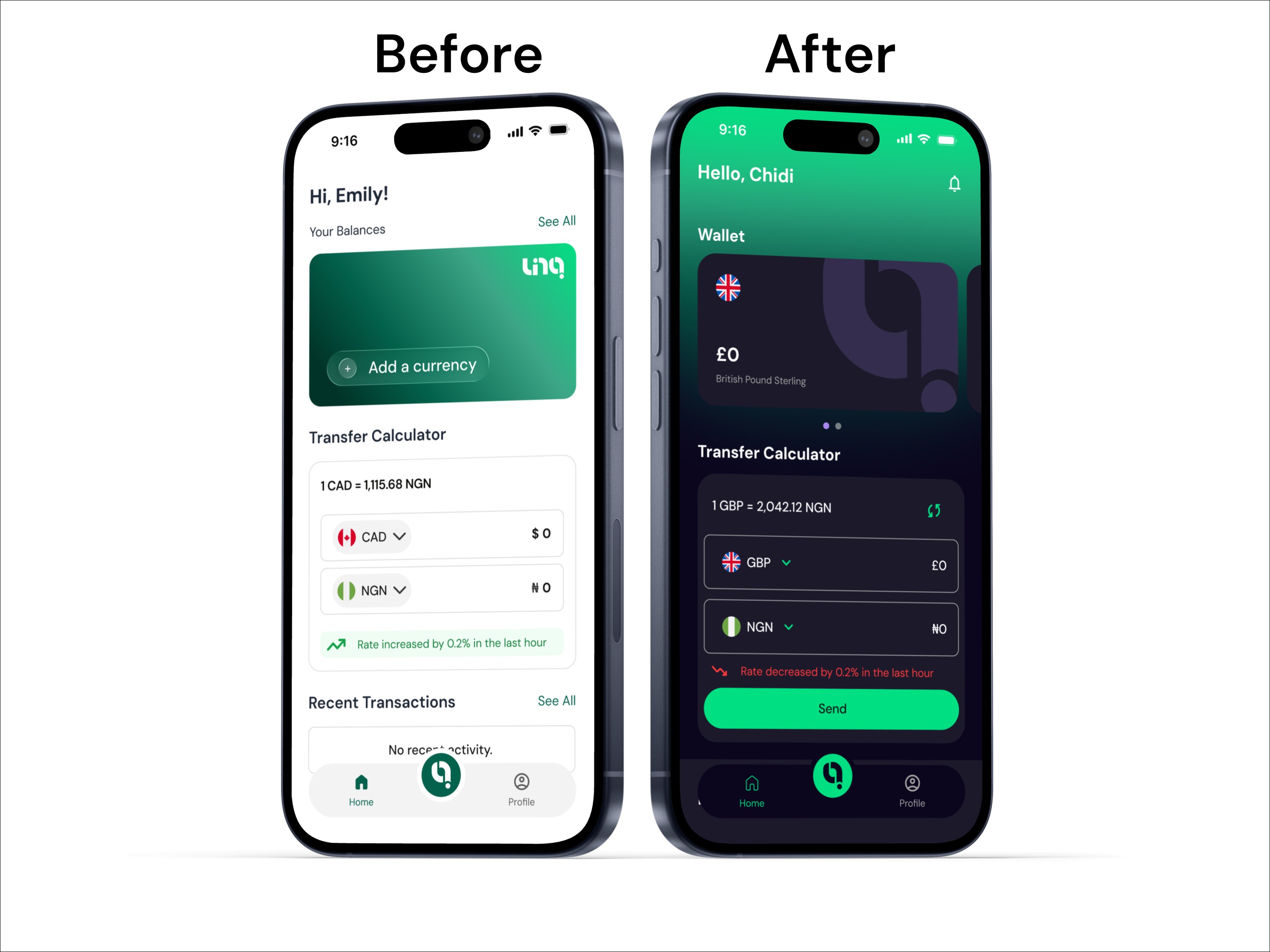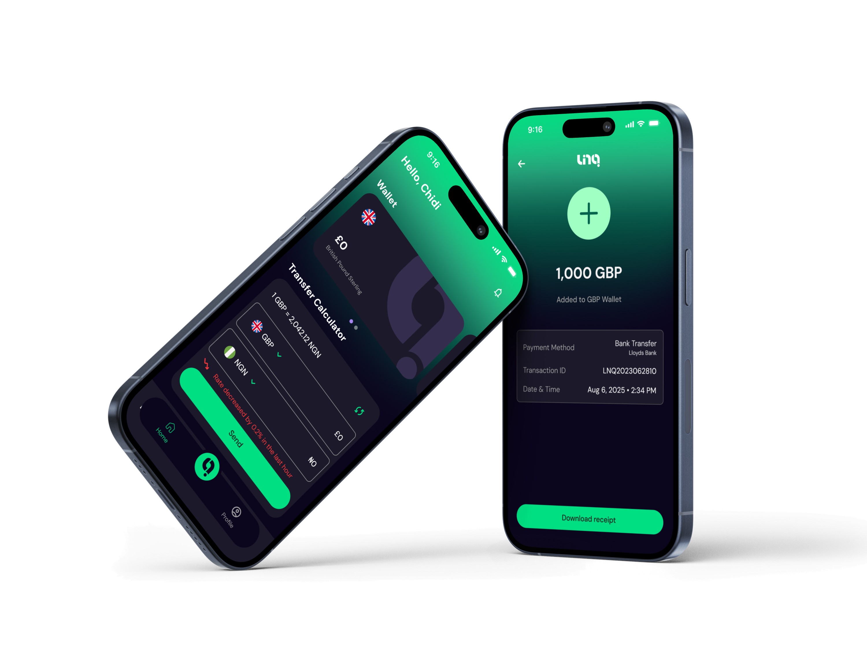 Linq is a multi-currency fintech app designed to make global payments seamless. Users can create wallets in NGN, USD, GBP, CAD and more, easily convert between currencies, and send or receive funds instantly. For merchants, Linq enables tap-to-pay transactions using NFC wristbands with configurable price presets, bridging digital payments with real-world selling scenarios.